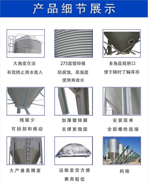 散裝料塔也就是我們所說的飼料存儲(chǔ)塔,它是一種適合大型和中型農(nóng)場(chǎng)的存儲(chǔ)設(shè)備。進(jìn)料設(shè)備在其出口處配備,有定期向豬舍中輸送飼料的功能。我們常見的料塔是由料倉(cāng)主體、料倉(cāng)翻蓋、爬梯以及立柱來組成的。散裝料塔其實(shí)通體不是圓柱體,因?yàn)橄虏康腻F體上有透視孔,所以可以觀察到料倉(cāng)內(nèi)飼料的高度。
